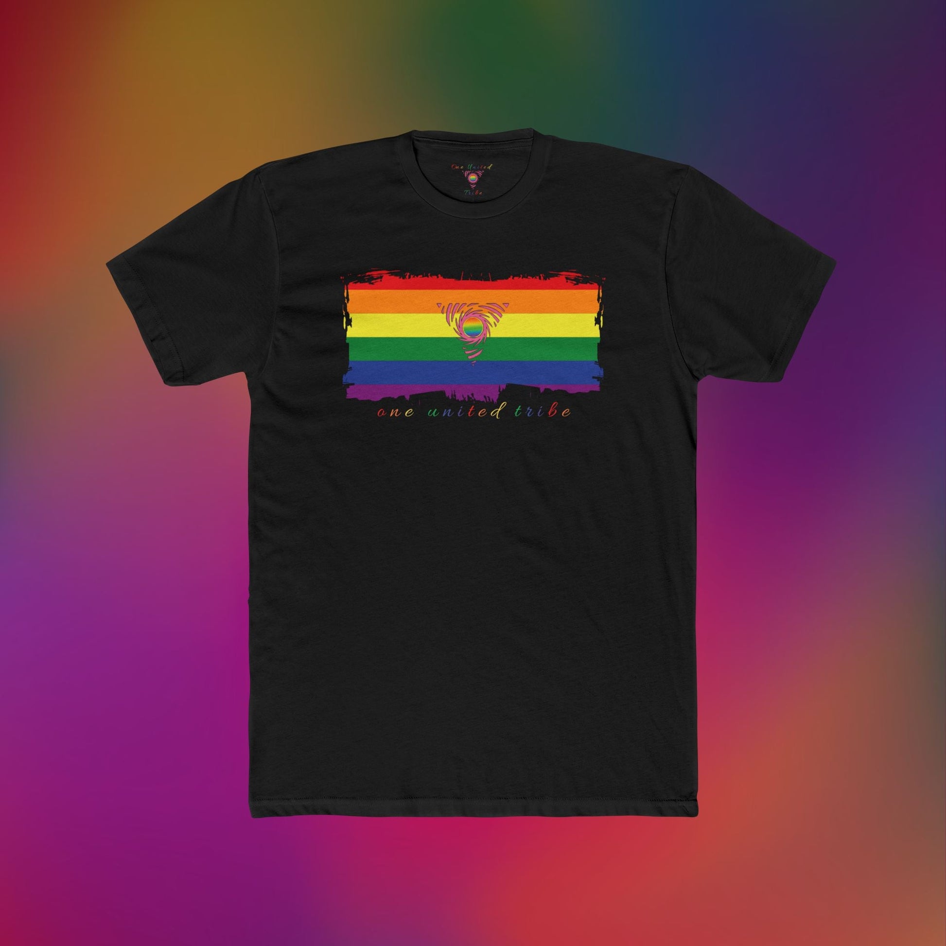 Embrace pride with a bold statement in the Tattered Rainbow Flag Tee. Featuring a distressed rainbow flag graphic with a prominent pink triangle symbol in the center, this shirt celebrates the strength and resilience of the LGBTQ+ community. The flag, paired with the message "One United Tribe," represents unity and solidarity across all identities.
