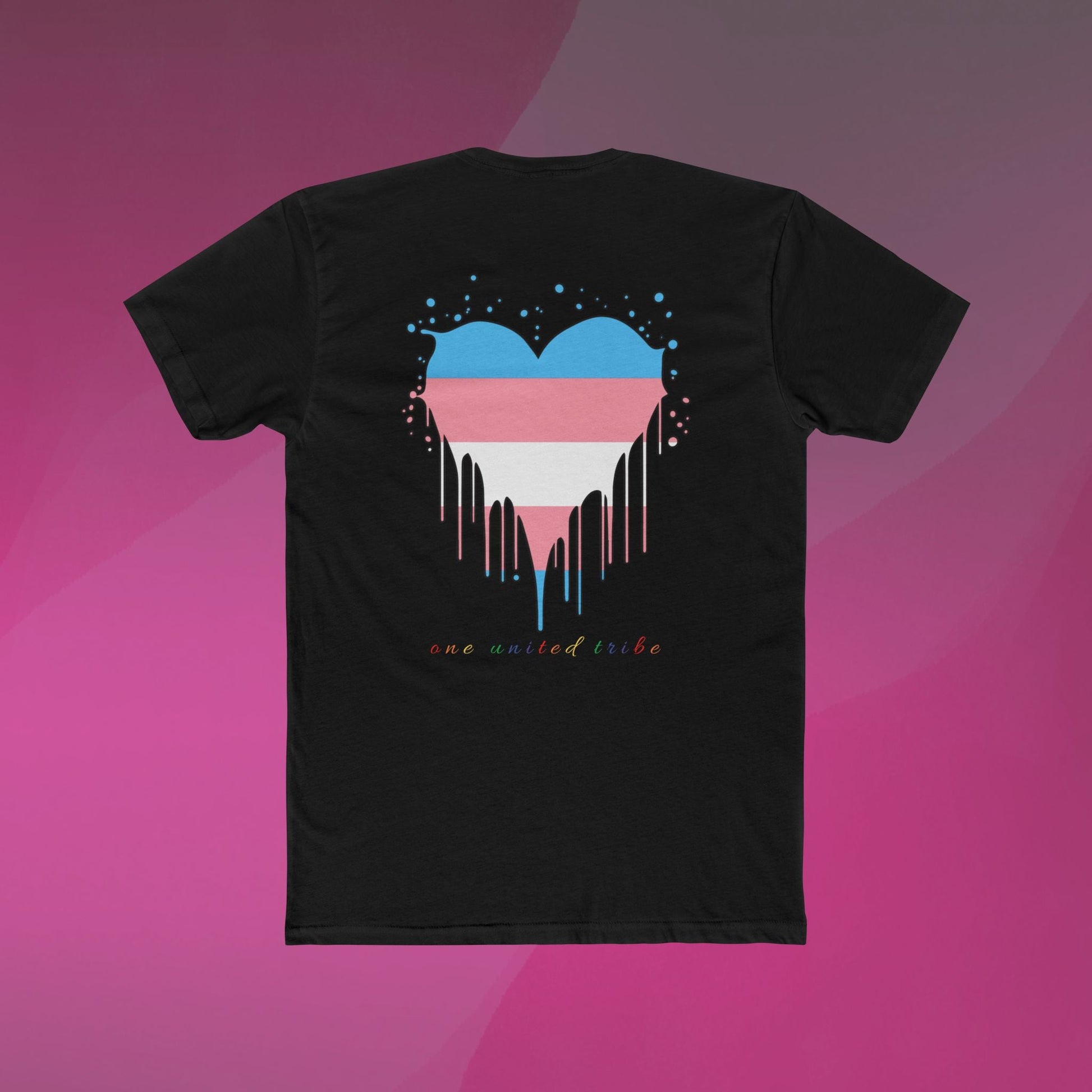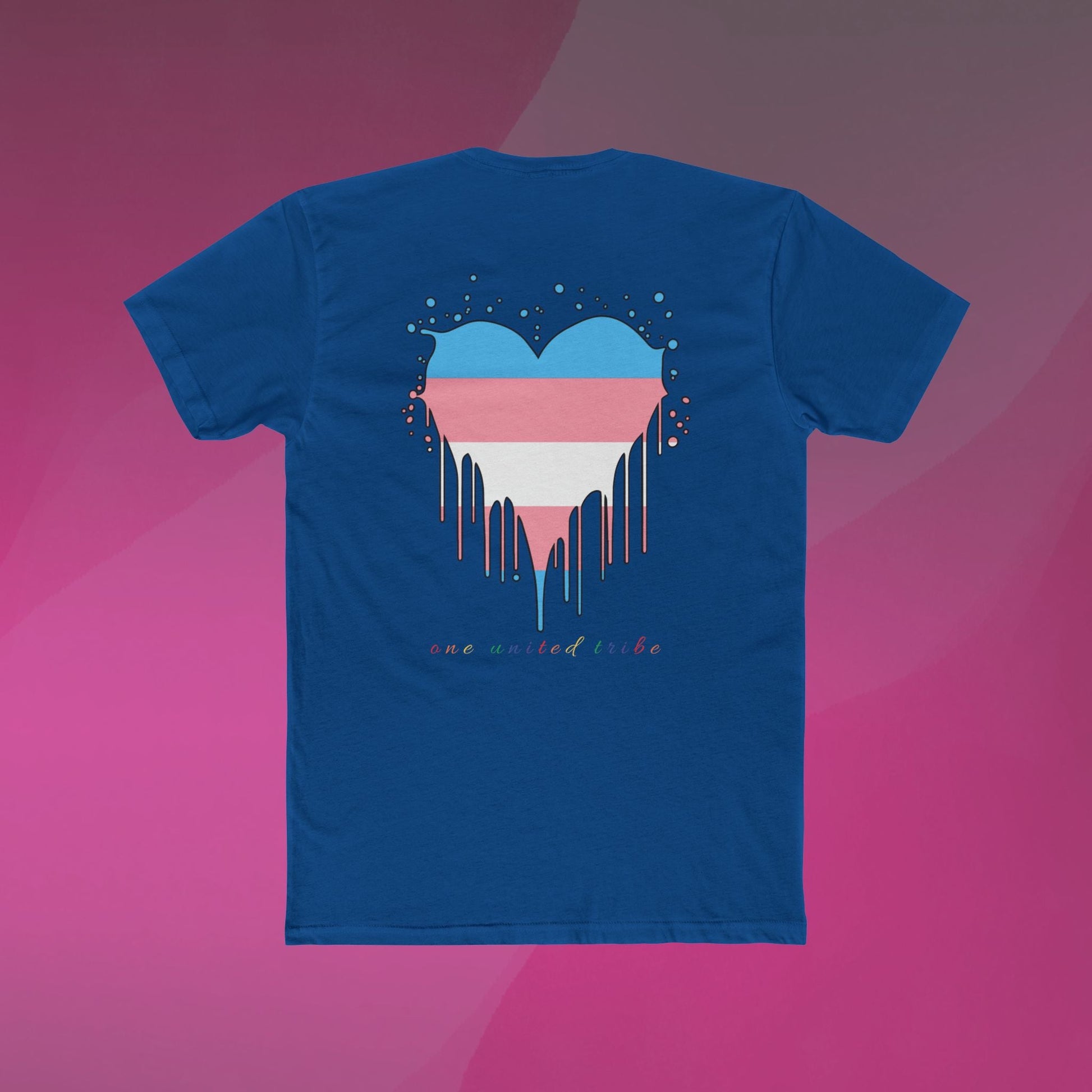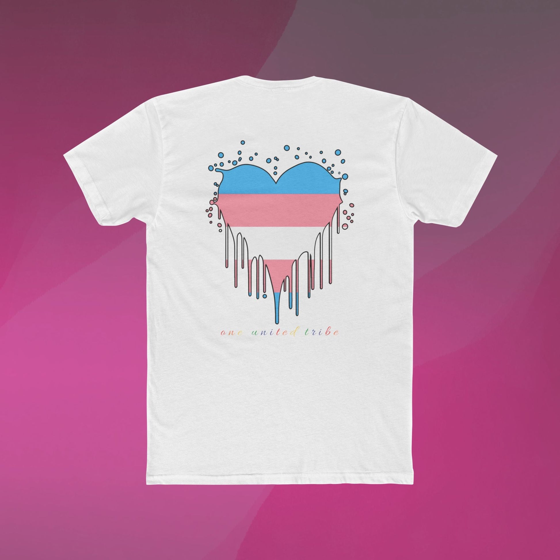 Celebrate your identity with the Trans Pride Heart Tee, a design that features the iconic transgender pride colors inside a heart-shaped graphic, beautifully melting down in a dripping, artistic style. Below the heart is the bold statement "One United Tribe," symbolizing inclusivity, support, and unity within the LGBTQ+ community.
