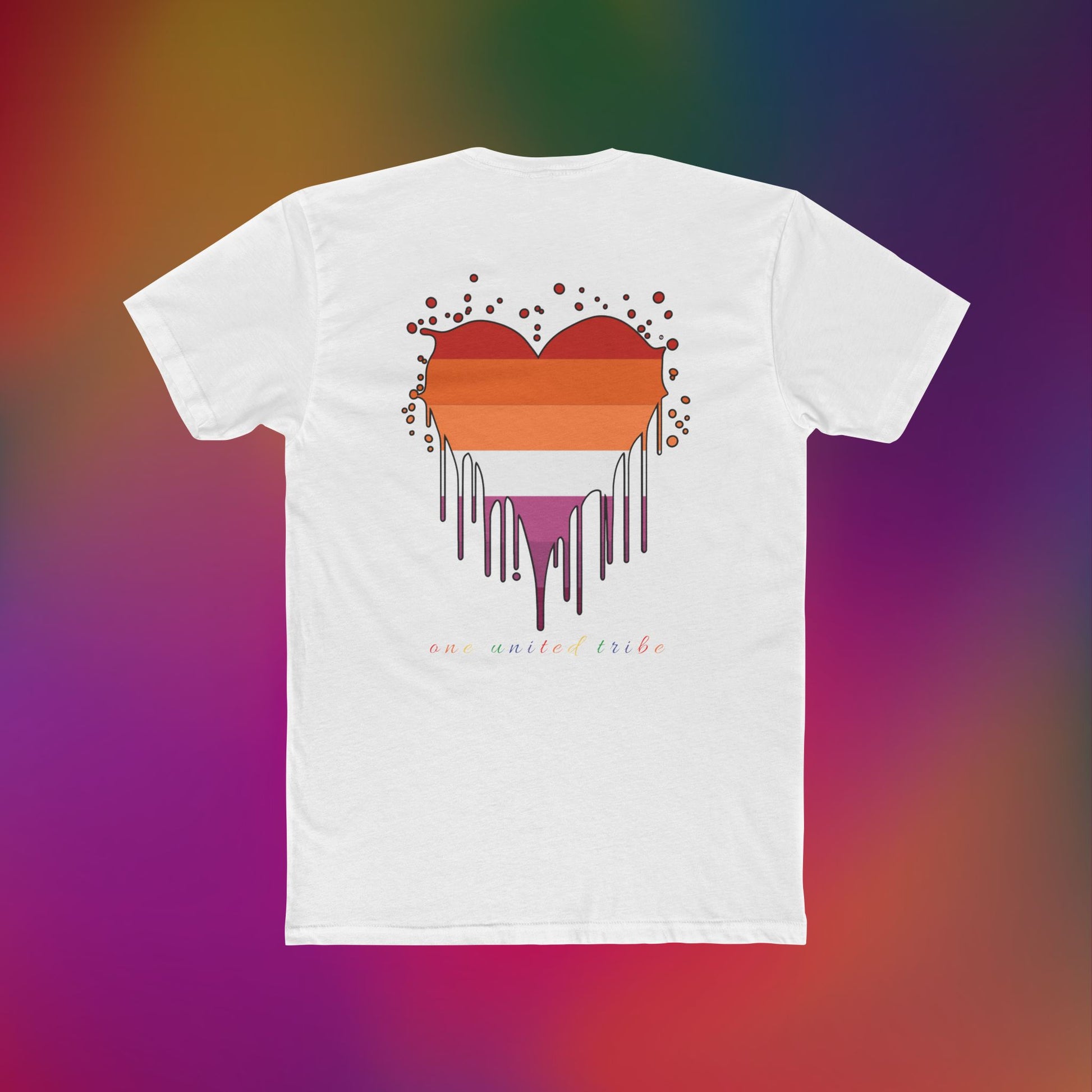 Show your pride and solidarity with the vibrant Lesbian Pride Heart T-Shirt. This design features the powerful colors of the lesbian pride flag beautifully dripping down from a heart symbol. The bold heart is framed by splashes of energy, emphasizing love and unity, while the words "one united tribe" remind us of the strength found in togetherness. Whether you’re at a pride event or simply expressing yourself, this shirt makes a strong statement of love and identity.